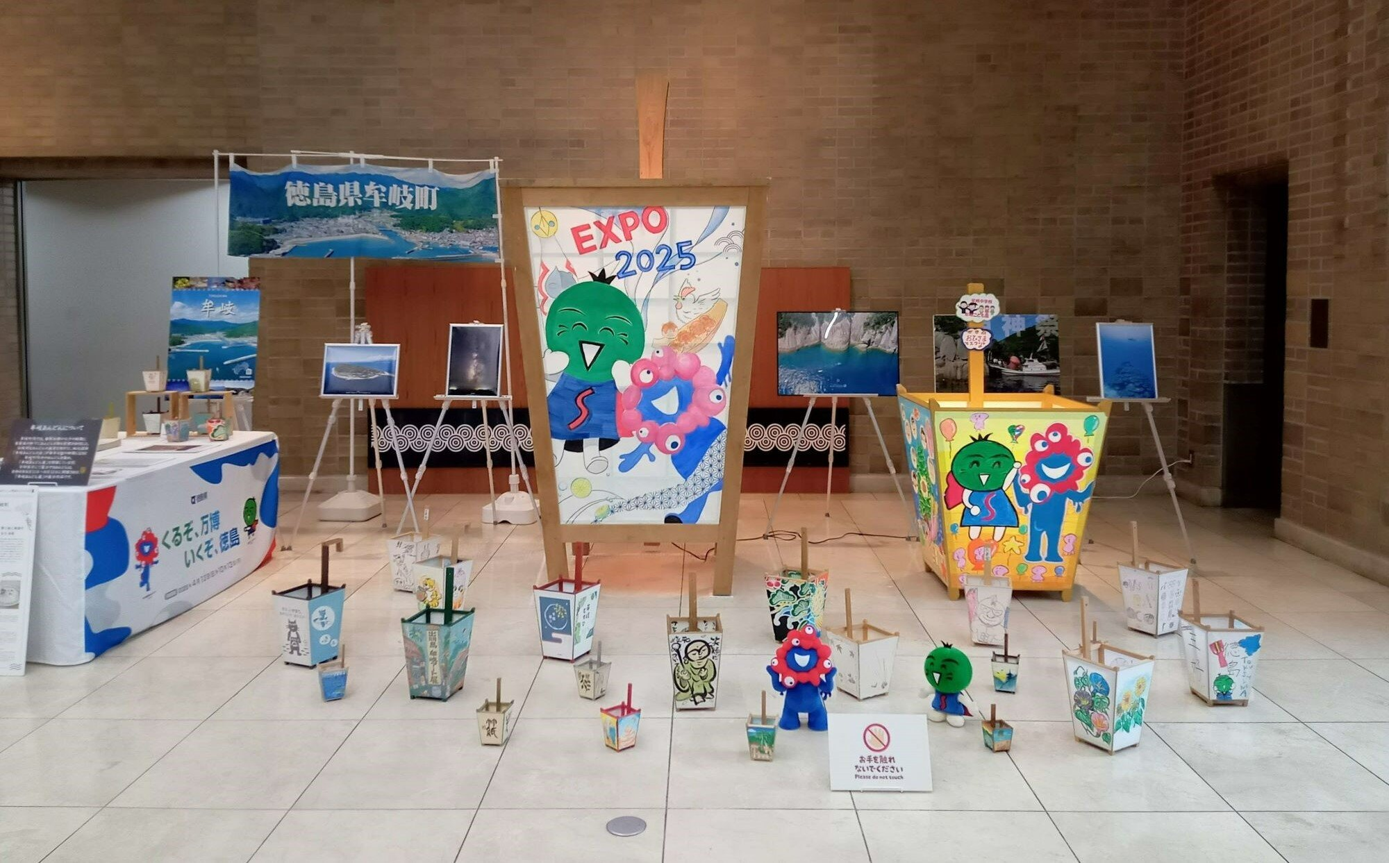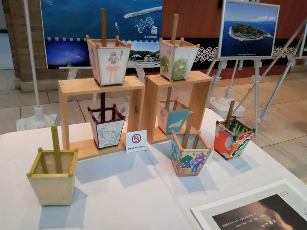 今回県庁にて展示するあんどんは、令和6年8月11日~8月12日に開催された「牟岐あんどん展」で展示されたもので、海部高校美術部・書道部の生徒が「大阪・関西万博」や「徳島」をテーマに彩った2mの”巨大あんどん”のほか、町内外の皆様が描いた作品となります。