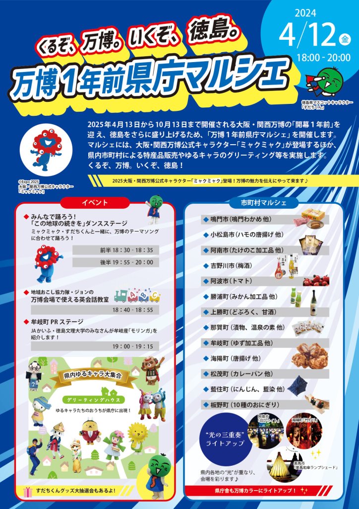 To celebrate the one-year countdown to Expo 2025 Osaka, Kansai, Tokushima Prefecture hosted the “One Year to Go! Expo Prefectural Office Marche” on Friday, April 12, 2024.