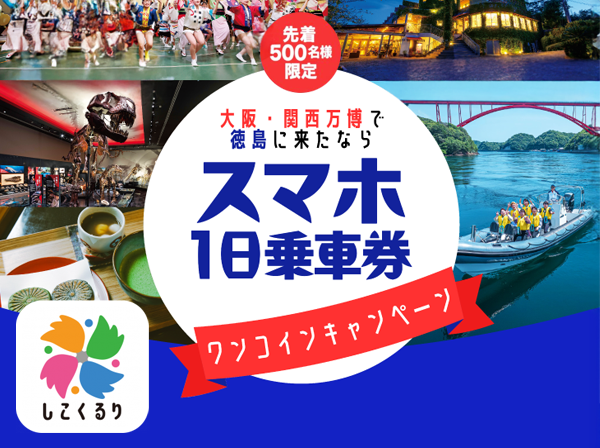 「しこくるり」アプリで徳島をお得に探索!大阪・関西万博の徳島県ゾーン来場者限定で、徳島バス一日乗車券が通常1,500円のところ500円に。先着500名限定で、徳島東部エリアの約40か所で特典も。2025年12月31日まで。