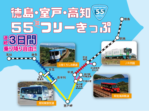 「徳島・室戸・高知55フリーパス」で四国東部を満喫!2025年3月30日~2026年4月2日の内3日間有効。JR四国(徳島~阿波海南、後免~高知)、阿佐海岸鉄道、高知東部交通バス、土佐くろしお鉄道が乗り放題。指定席や特急券は別途必要です。
